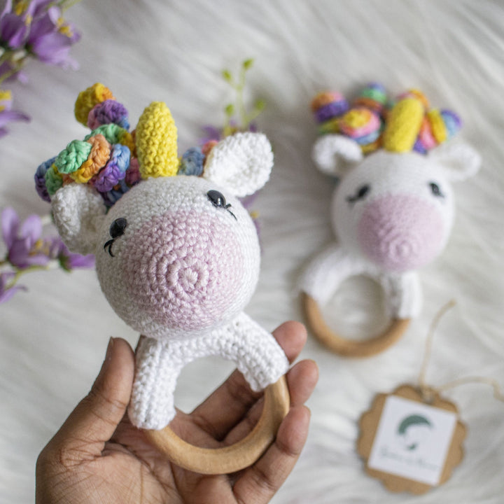 These handmade crochet rattles are soft and colourful with smooth handle of natural wood. Our wooden baby rattles are made of natural wood, environment friendly, safe and burr-free. These rattles help in developing fine motor skills, stimulating sensory development, hearing and tactile senses and generate attention.