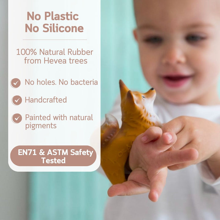 Rob the Fox is an animal-shaped chewable bracelet perfect as a teether, bath toy and sensory play. It has travelled from the green forests to jump onto babies' and kids’ wrists. Ready for kids to wear it all day long and take it to every adventure! Hand-painted with natural pigments, 100% safe for kids!