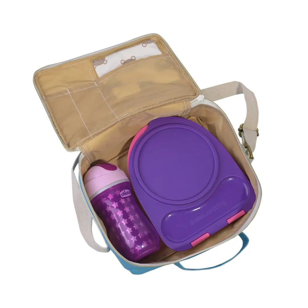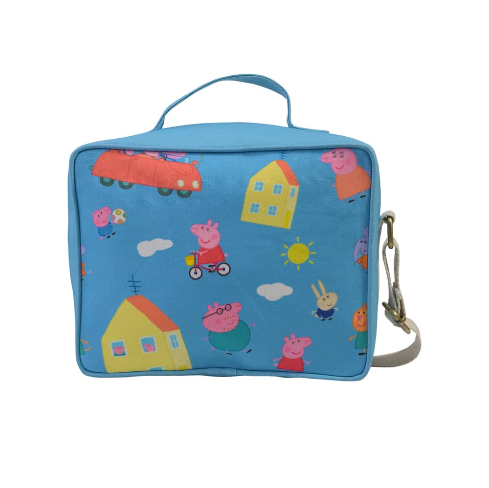 Peppa Paradise Printed Junior Hot Meal Tiffin Bag/Sling: A charming, compact mealtime companion for kids. With Peppa Pig designs, it's perfect for carrying snacks or lunch in style. , the Junior Hot Meal Tiffin Bag/Sling, a convenient and eco-conscious accessory designed to carry your hot meals while you're on the move. Crafted from recycled PET felt, this tiffin bag/sling offers a sustainable solution for transporting your food. Its insulated interior keeps your meals warm, making it an ideal companion for travel, picnics, or daily commutes.