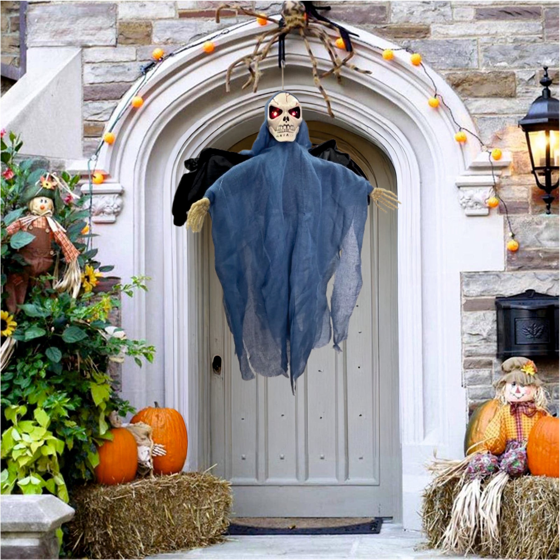 Ideal for porches, trees, doorways, or haunted houses, this spooky reaper sways eerily in the breeze, making your Halloween décor feel alive with dread.