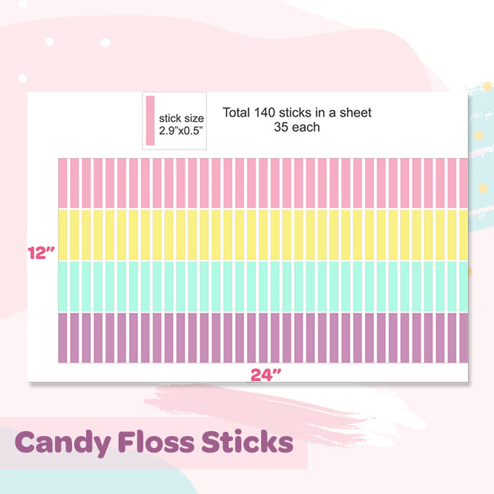 Size of the Wall Sticker: This set of mini wall art stickers for kids comes in a single sheet. The approximate size of each sheet is H x W: 12"" x 24"". The approximate size of each Candy Floss Sticks wall sticker is 2.09” x 0.5.