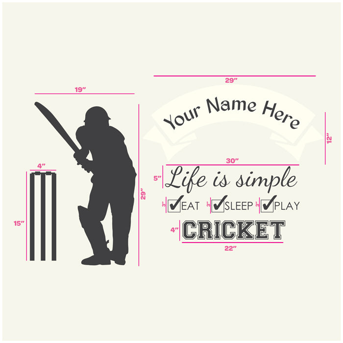Each individual piece of wall decal for kids is a three-cut sticker that comes in one sheet in the approximate size 38"" x 30"". The approximate size of the individual pieces is - Batsman: 19""X29"", Balls: 4"" , Set of Stumps: 4""X15"", Personalised Name: 29""X12"", Assorted Text: 5""X30"", 3"" Height, 4""X22"".