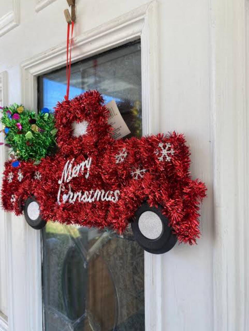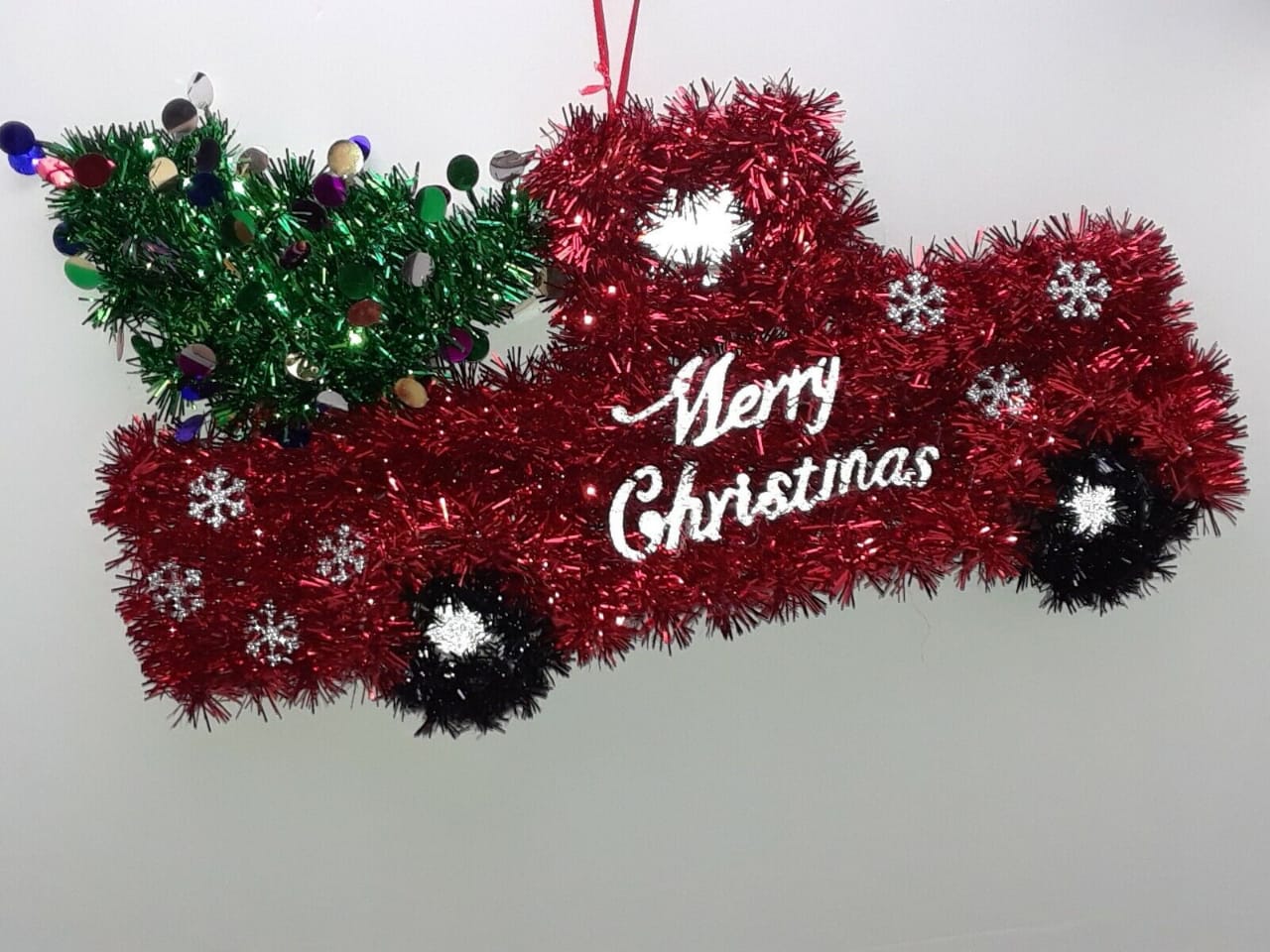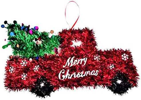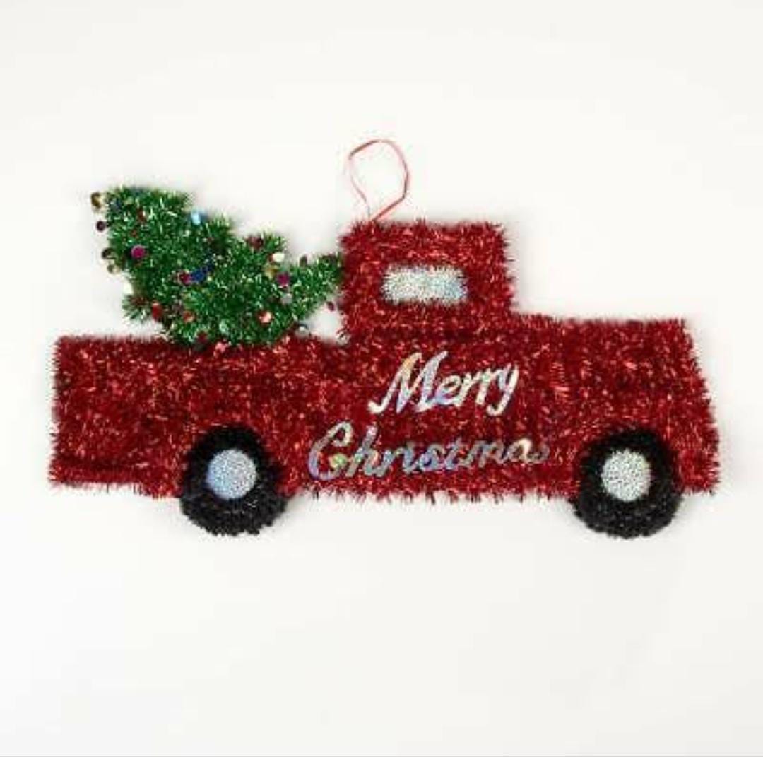FRINGE DESIGN: Have a unique and cute decoration with this 3D decoration that features a red truck with wreath on the hood, ""Merry Christmas"" headline on the side and carrying a green Christmas tree at the back