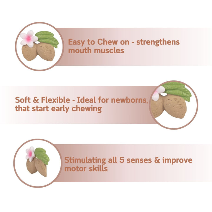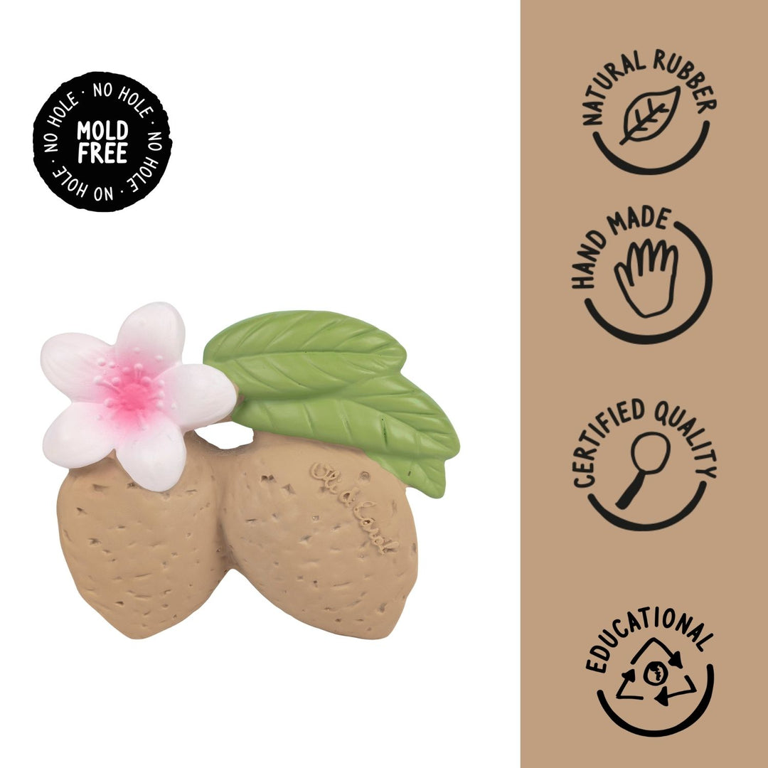 Aly The Almond is a fruit-shaped baby teether that will stimulate babies’ senses while soothing little gums. Introduce kids into a healthy lifestyle from a young age! It will become babies and kids’ favourite teether, bath toy and sensory play toy.