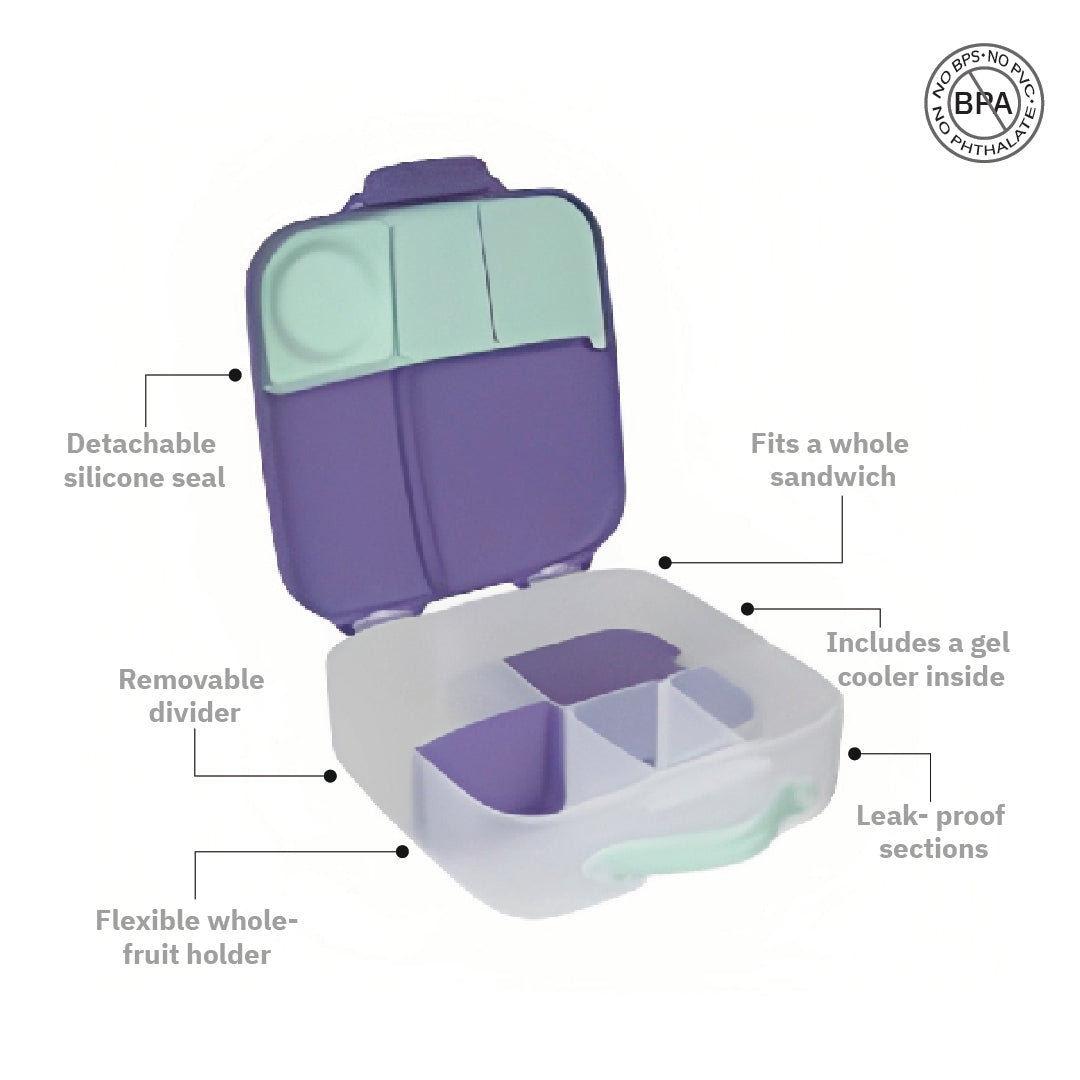 The whole foods lunchbox. Kids love different choices throughout the day, so we’ve designed a lunchbox that offers parents and kids more flexibility. The lunchbox features a large compartment that fits a whole sandwich. Plus, sitting underneath the tray is an included gel cooler pack to keep food fresher and cooler for longer. Or, remove the sandwich tray and the compartment now easily fits pasta and salads. Its unique flexi whole fruit holder lets you store a whole apple, as the stretchy seal bends around the shape of your fruit – no need to cut fruit into smaller sizes! Leak-proof silicone seals lets you store wet foods like watermelon and yoghurts (no liquids). The custom divider slides across enabling parents to adjust the compartment size as they need, or remove it to fit a whole banana or wrap.