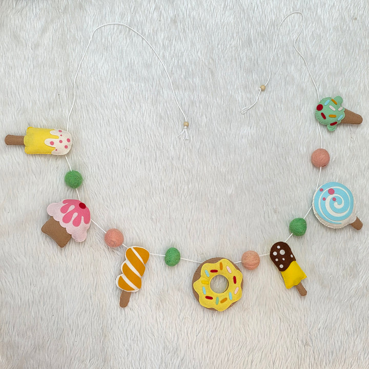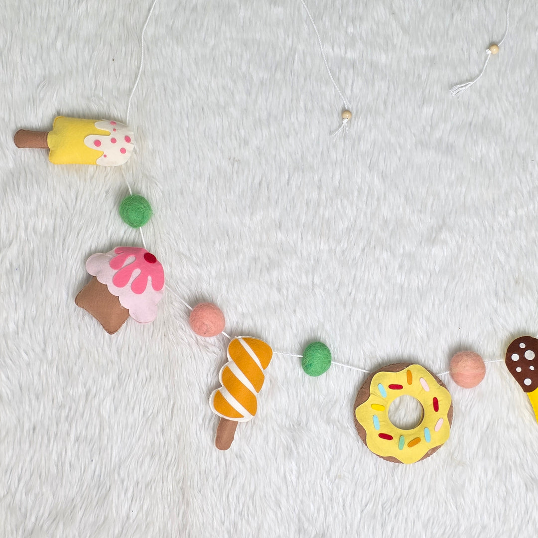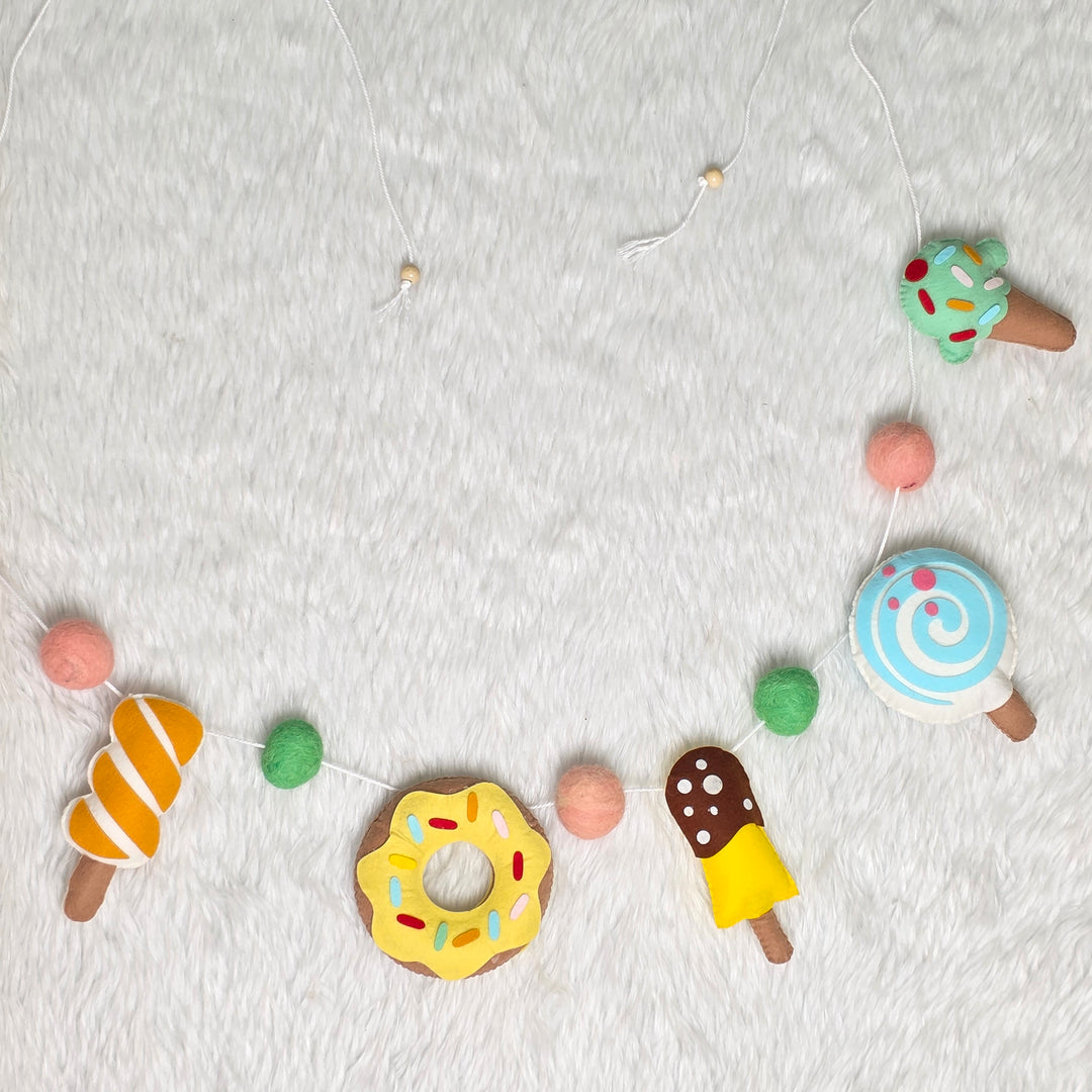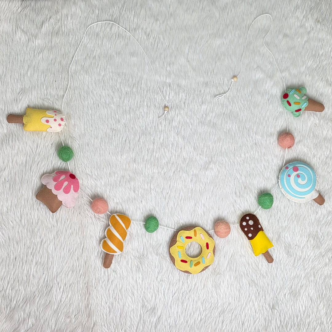 Add a sprinkle of joy and a scoop of cuteness to your little one’s space with our Sweet Treats garland! Featuring an adorable mix of felt ice creams, donuts, cupcakes, and lollipops in soft pastel shades, this handcrafted bunting is a dessert lover’s dream come true — minus the sugar rush!