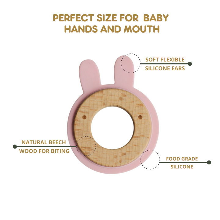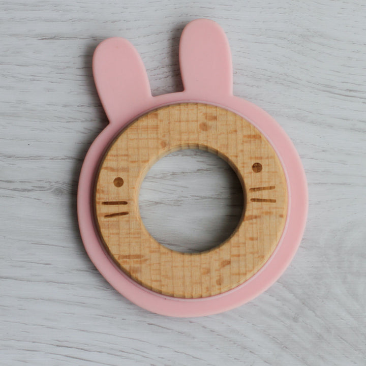 Wood + Silicone Disc Teether- RABBIT Shape- Pink