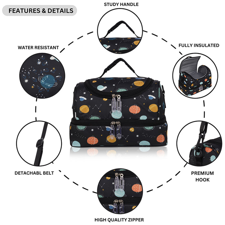 It keeps the food warm or cool,due to its INSULATED INTERIOR. It has a  detachable belt that can be adjusted as per the kids height and a Convenient Handle too.