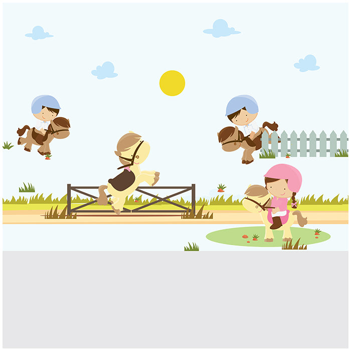 This set of decals comes in 4 sheets. Each individual sheet is a three cut sticker. The approximate size of each sheet is 52"" x 28"", 52"" x 28"" & 52"" x 12"", 52"" x 12"". The approximate size of the all individual pieces is - Horse: 22.5""x16"", 17""x15"", 11""x13"" & 16""x17"", Grass: 14""x4"", 7""x3"", Fence: 28""x8"", Sun: 9""x9"", Green Patch: 27""x5"", Clouds: 11""x5"", Assorted Stones: 2""x1.5"".