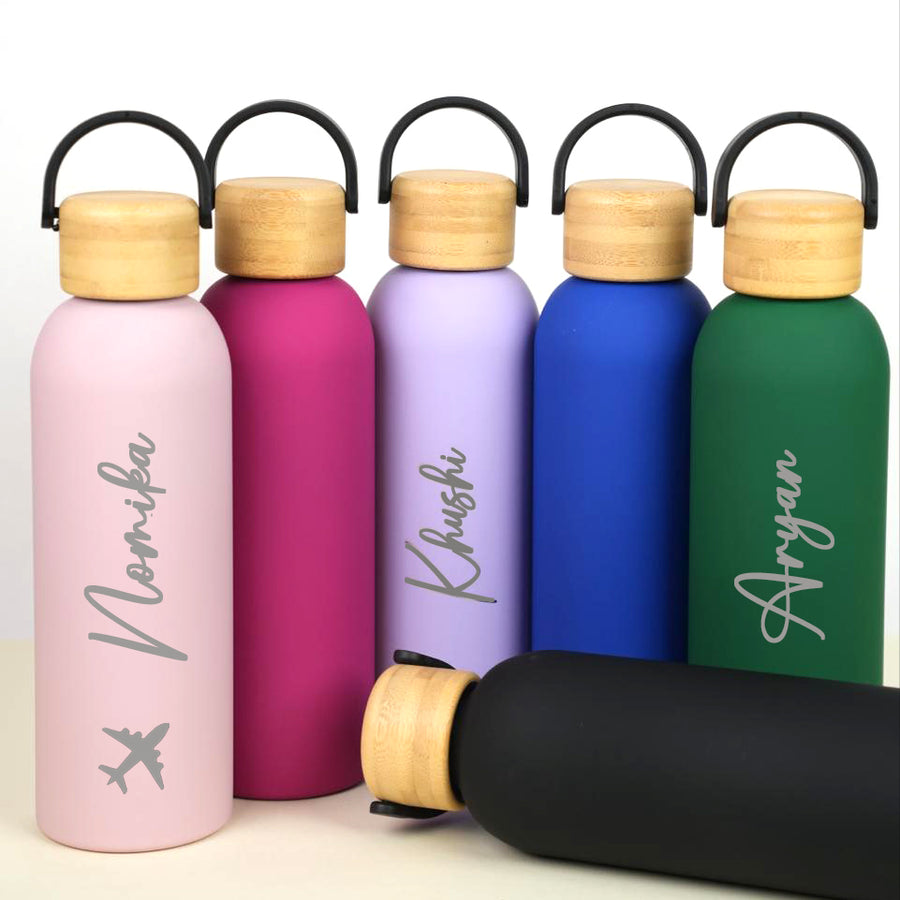 Say goodbye to disposable bottles and elevate your hydration game with this eco-friendly Insulated Bottle with Handle. Featuring a beautifully designed wooden finish lid and a sturdy handle for easy carrying, it combines both function and fashion. The insulation ensures that your beverages stay at the perfect temperature—whether hot or cold—for hours. Our bottle is perfect for everyday use, whether you're hitting the gym, heading to the office, school or play.The bottles are leak proof and BPA Free. Select from fun design & add your name for a personal touch ( Designs are optional )