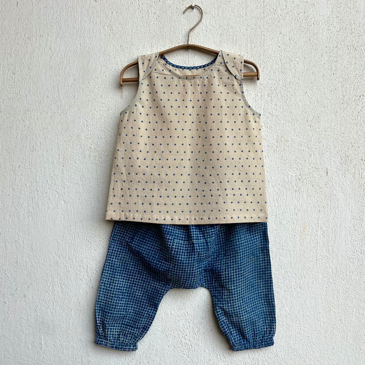 1 x jhabla top: 100% organic cotton sleeveless top with envelope neck for hassle-free wearing. Hand block printed polka top created by traditional Ajrakh artisans in naturally hypoallergenic indigo colour. 1 x pants: 100% organic cotton. Handblock printed in indigo by the same family. Elasticated waistband and bottom hem. Part of our Zoo Treat poem collection. Sizes 2 years and above have side pockets and adjustable waist strings. Conscious of minimising waste, the set is packed in a reusable muslin bag with an interactive paper game tag, ready for gifting.