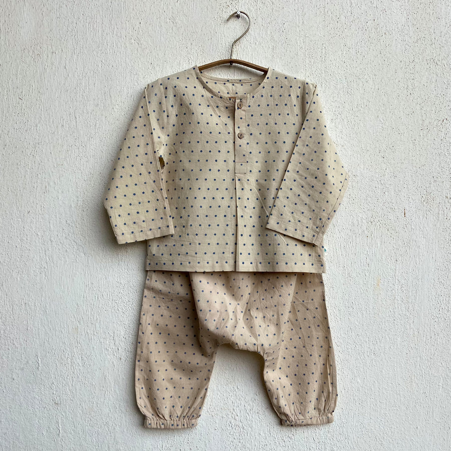 1 x kurta top: 100% organic cotton hand block printed polka top created by traditional Ajrakh artisans in naturally hypoallergenic indigo colour. Wooden buttons closures for easy wear and flat seams that do not irritate the soft skin of your little munchkins. 1 x pants: 100% organic cotton matching pants. Elasticated waistband and bottom hem. Sizes 2 years and above have side pockets and adjustable waist strings. Part of our Zoo Treat collection. Conscious of minimising waste, the set is packed in a reusable muslin bag with an interactive paper game tag, ready for gifting.