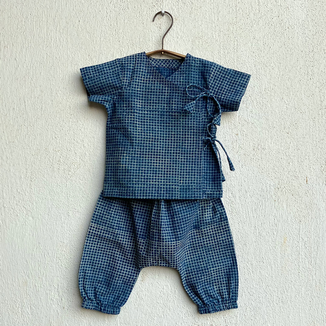 2 x angarakha tops: 100% organic cotton, the indigo polka and checks are hand-block printed by Ajrakh artisans in rural Gujarat. Tie-up closures and flat seams for ease of wearing and fit. Stitching detail on the neckline adds stability and aesthetic value.