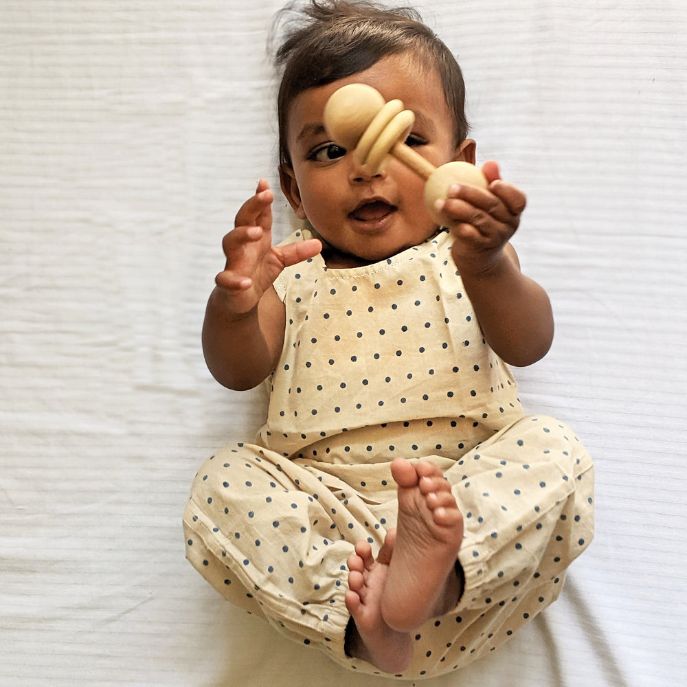 2 x jhabla tops: 100% organic cotton sleeveless top with envelope neck for hassle-free wearing. Hand block printed animals in a sea of blue and a printed polka design created by traditional Ajrakh artisans in naturally hypoallergenic indigo colour. 1 x pants: 100% organic cotton. Matching handblock printed polka pants with elasticated waistband and bottom hem. Part of our Zoo Treat poem collection. Sizes 2 years and above have side pockets and adjustable waist strings. Conscious of minimising waste, the set is packed in a reusable muslin bag with an interactive paper game tag, ready for gifting.