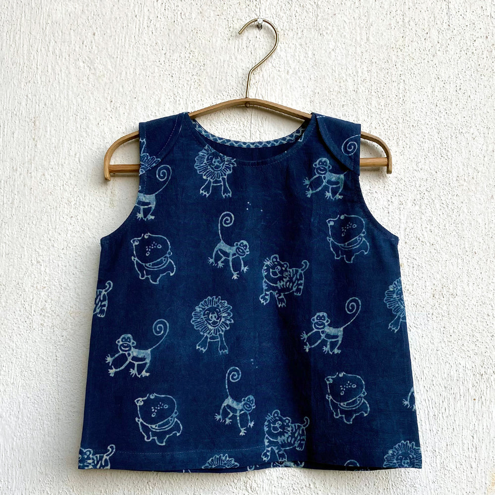 1 x jhabla top: 100% organic cotton sleeveless top with envelope neck for hassle-free wearing. Hand block printed animals in a sea of blue created by traditional Ajrakh artisans in naturally hypoallergenic indigo colour. 1 x pants: 100% organic cotton. Matching handblock printed polka pants with elasticated waistband and bottom hem. Part of our Zoo Treat poem collection. Sizes 2 years and above have side pockets and adjustable waist strings.Conscious of minimising waste, the set is packed in a reusable muslin bag with an interactive paper game tag, ready for gifting.